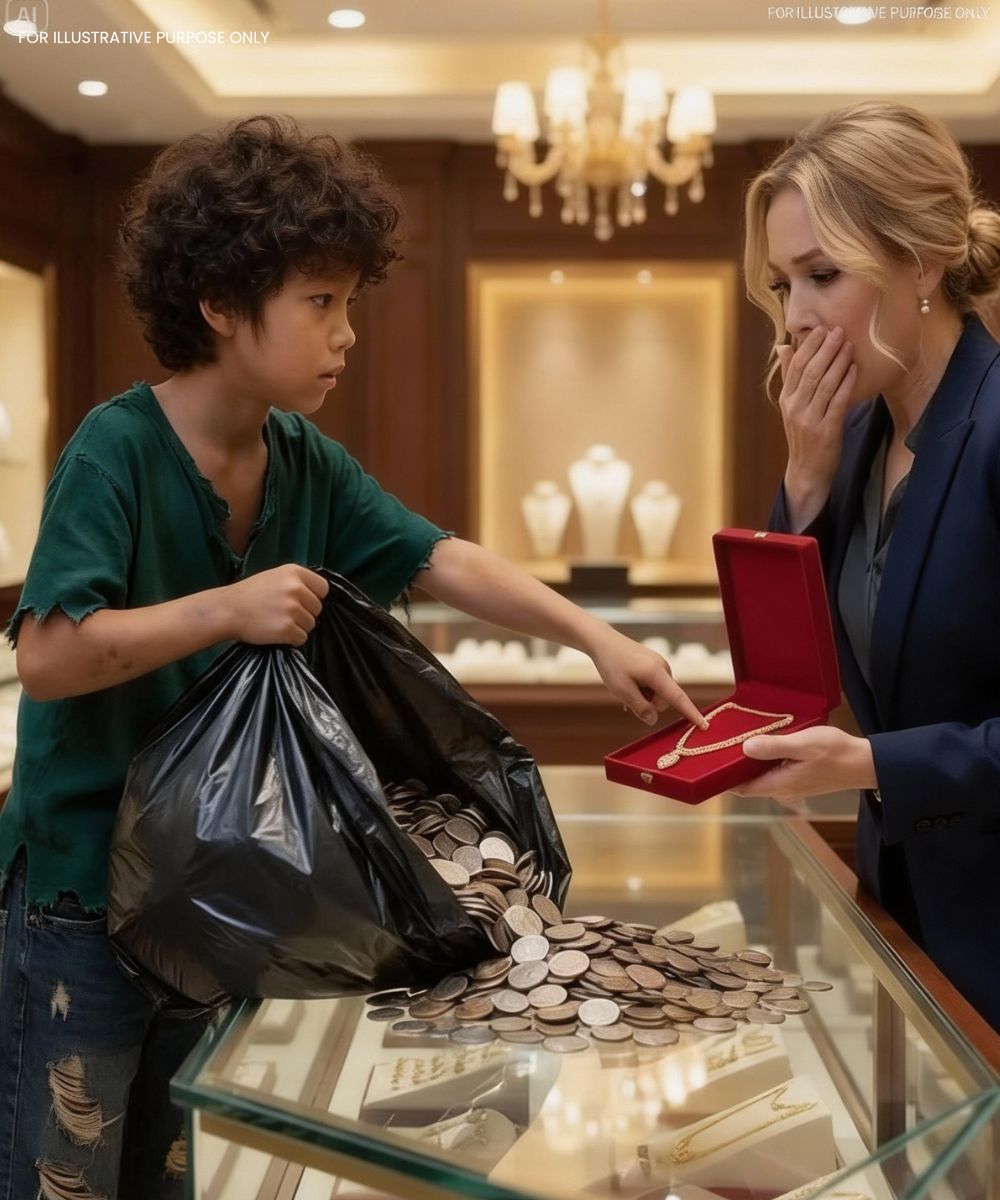 Een klein, haveloos jongetje strooide zwijgend duizenden munten over de glazen toonbank van een chique juwelier.