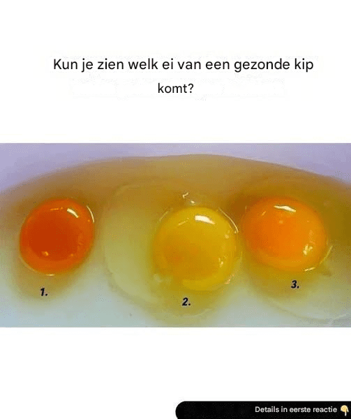 - Vrijlopende kippen eten af en toe insecten, waardoor de eierdooiers donkerder zijn dan die van kippen in kooien, maar lichter dan die van kippen die in de wei lopen.